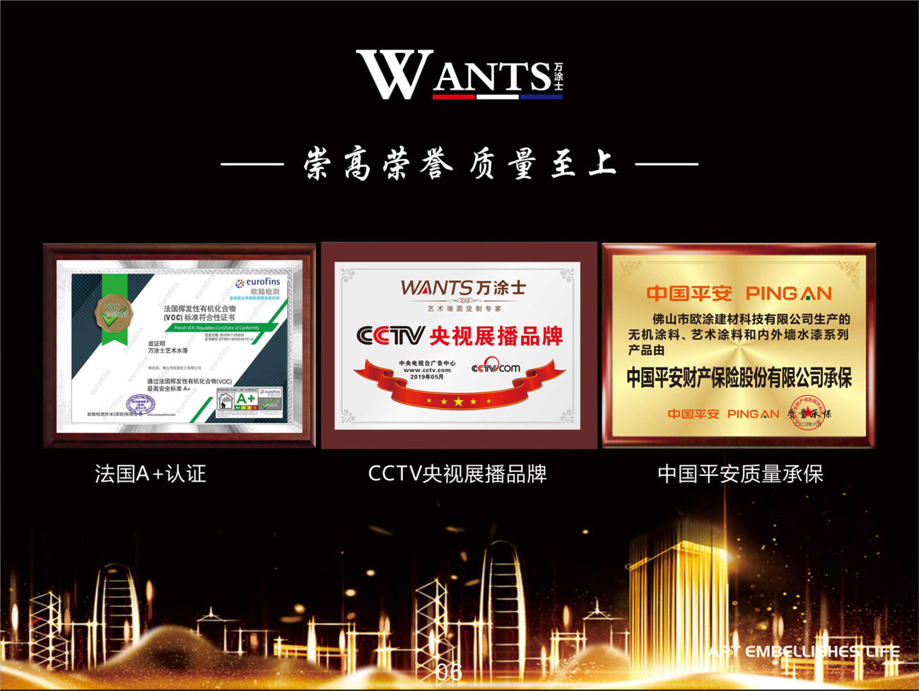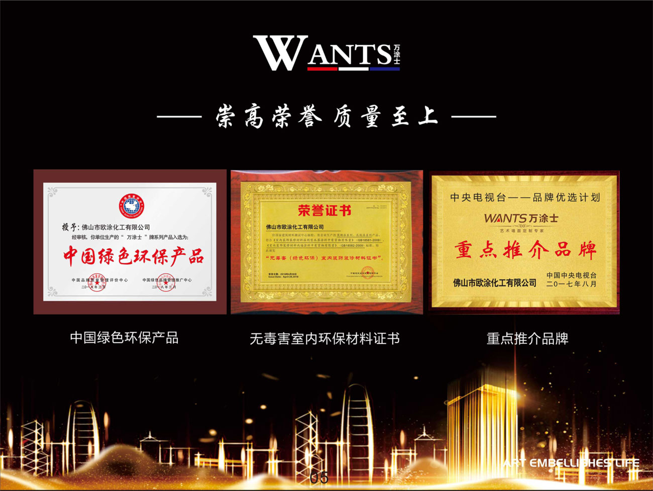 公司拥有先进的生产技术及质量检测系统,并与国际先进的管理和高科技接轨,质量体系严格按照总部的质量标准及国际通过的IS09001质量体系执行,向客户提供优质、环保的产品,获得了消费者的一致认同,赢得了社会的普遍赞誉。2010年低碳经济论坛受邀企业、荣获中国健康漆品牌等荣誉、通过IS09001质量管理体系、IS014001环境管理体系认证、中国环境产品认证、全国守合同重信用企业、先后被授予“广东省高新技术企业”、“广东省民营科技企业”、“广东省质量信得过企业”。